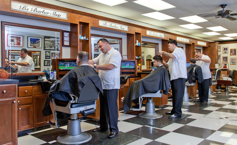Boris, Chris, and Vlad (left to right) styling hair at B’s Barber Shop.